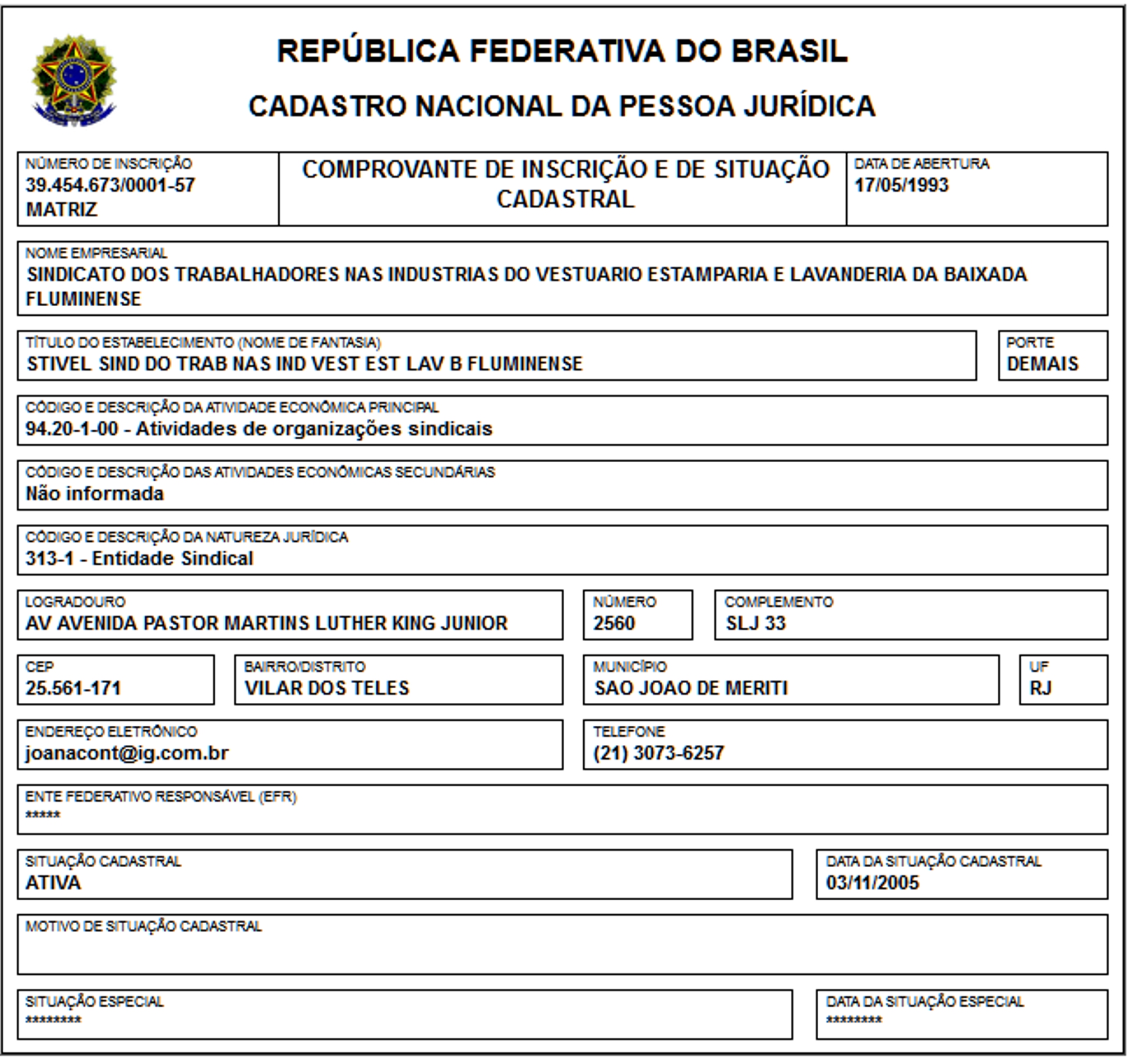 Sindicato dos Trabalhadores nas Indústrias do Vestuário, Estamparia e Lavanderia Da Baixada Fluminense CNPJ: 39.454.673/0001-57 endereço: Rua Egas Muniz, 110 sala 202 - V dos Teles - SJM - RJ Cep: 25.576-271. tel: (21) 2491-7236.